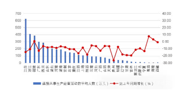 圖 4 2025 年上半年各地區(qū)直接從事生產(chǎn)經(jīng)營活動的平均人數(shù)及其增長情況
